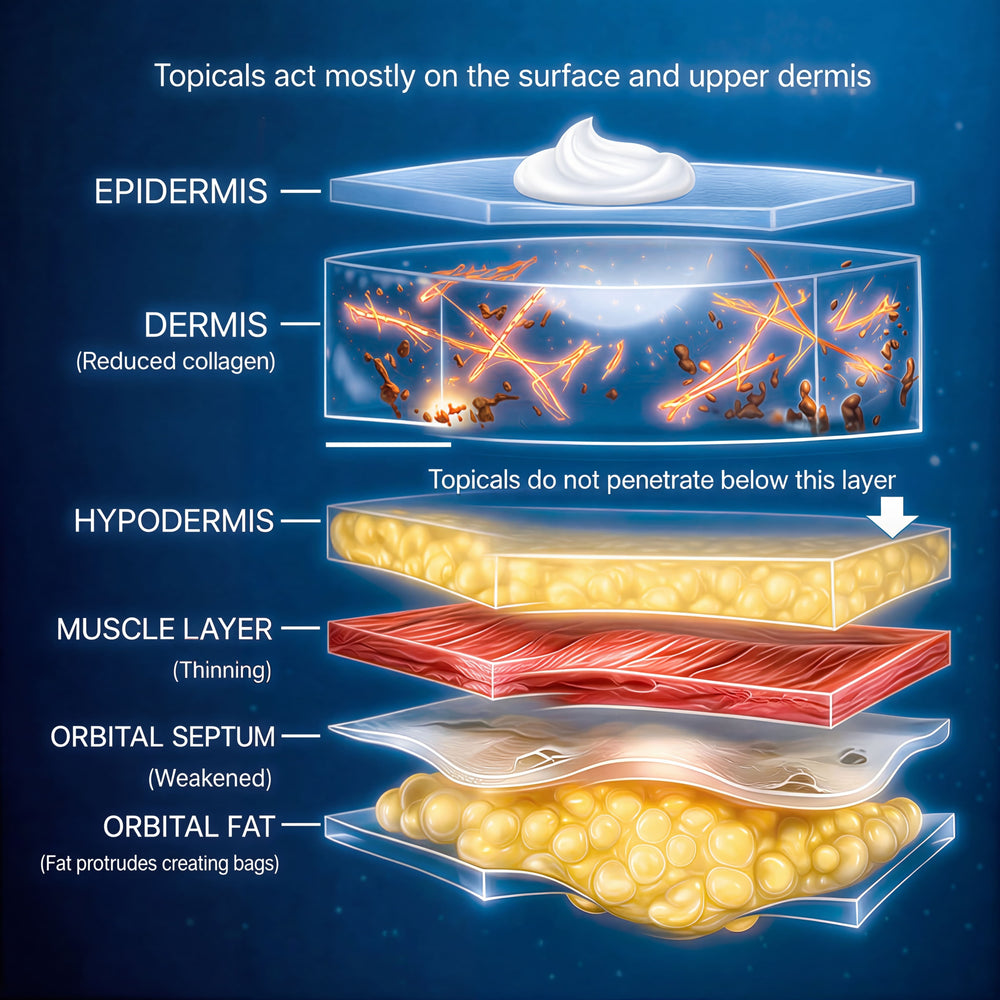 It starts deeper — in the thinning support structures and underlying tissue that hold the area firm.